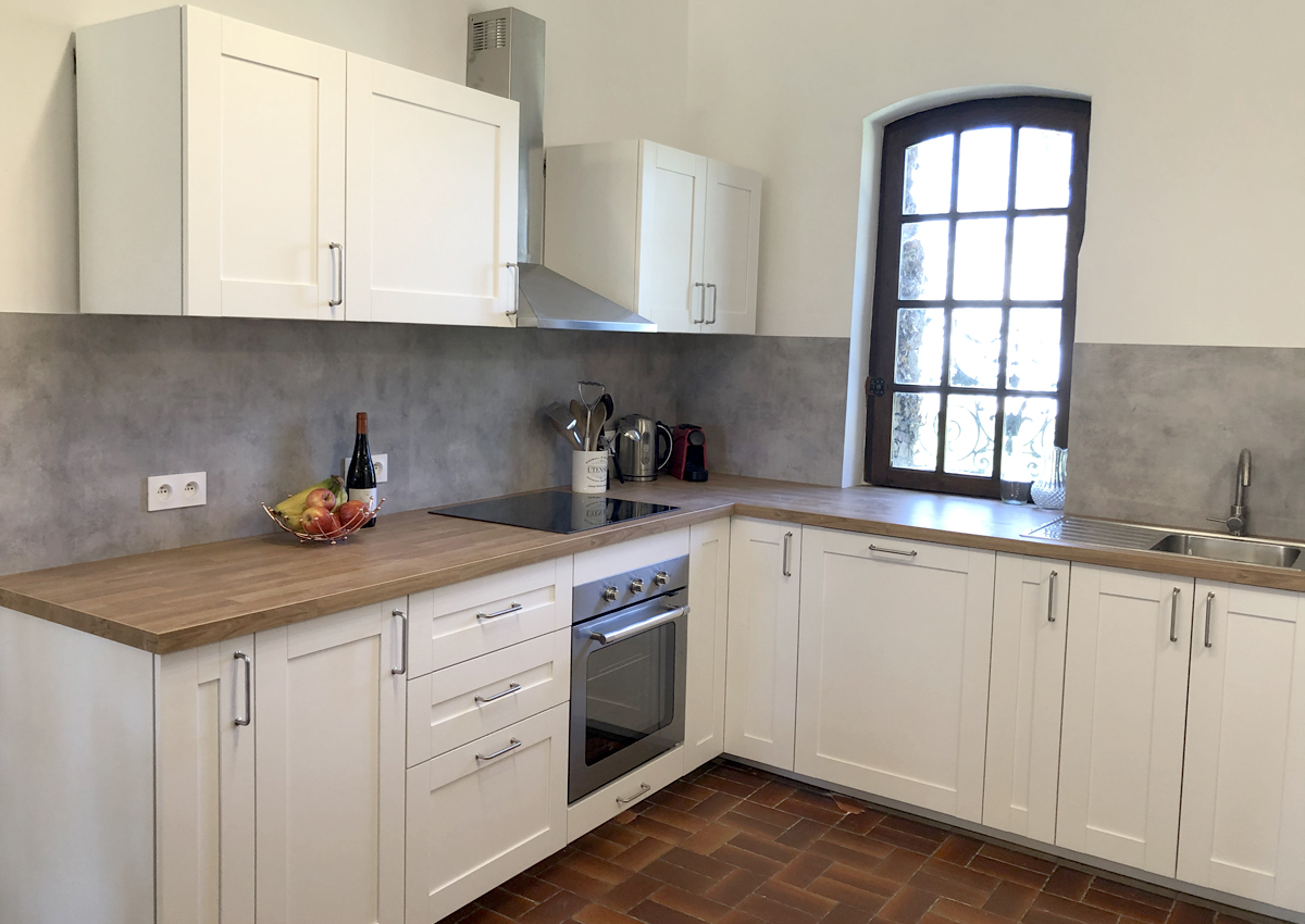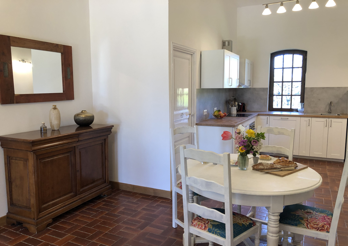Malepère is a lovely, spacious one bedroom apartment. Access is via a small flight of exterior stairs which lead to a bright, open plan living space with a modern, fully equipped kitchen. The lounge area has a comfortable sofa with cable television (French) and DVD player. Just off the lounge you will find a balcony with views over the gardens, swimming pool and distant Pyrenees - the perfect place to relax.